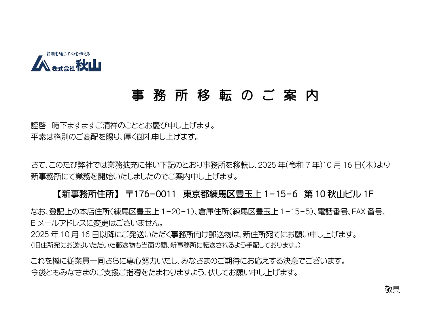 【新事務所住所】 〒176-0011 東京都練馬区豊玉上1-15-6 第10秋山ビル1F
